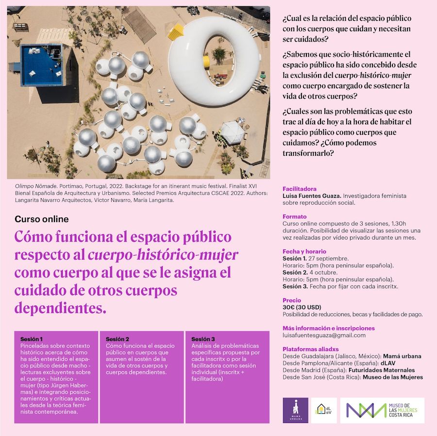 “Cómo funciona el espacio público respecto al cuerpo-histórico-mujer como cuerpo al que se le asigna el cuidado de otros cuerpos dependientes” -curso online con Mamá Urbana (Guadalajara, México), Museo de las Mujeres (San José, Costa Rica) y dLAV (Alicante/Pamplona, España) como plataformas aliadxs.