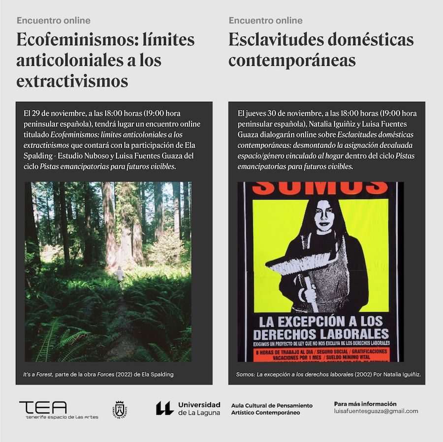 Esta semana ahondaremos en “Ecofeminismos: límites anticoloniales a los extractivismos” con Ela Spalding – Estudio Nuboso (desde Panamá) y “Esclavitudes domésticas contemporáneas: desmontando la asignación devaluada espacio/género vinculado al hogar” con Natañia Iguiñiz (desde Perú), ambos serán conversatorios abiertos/online programados por TEA Tenerife Espacio de las Arte en colaboración con Aula Cultural de Pensamiento Artístico Contemporáneo Facultad de Bellas Artes Universidad de La Laguna.