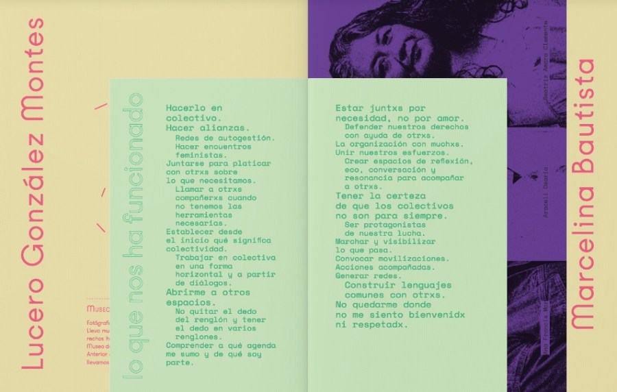 Obra cabecera: Imagen correspondiente a dos páginas del cuaderno Deseidades: rutas posibles desde los feminismos (2023) impulsado por DISIDENTA – Comunidad de práctica social + saberes feministas, las cuales incluyen los testimonios de Lucero González Montes y Marcelina Bautista.
