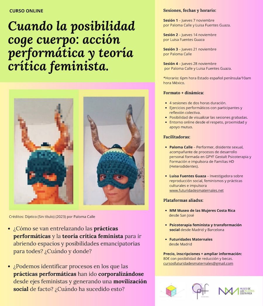 Curso online: “Cuando la posibilidad coge cuerpo: acción performática y teoría crítica feminista. ¿Cómo se van entrelazando las prácticas performáticas y la teoría crítica feminista para abrir espacios y posibilidades emancipatorias para todes? ¿Podemos identificar procesos en los que las prácticas performáticas han ido corporalizándose desde ejes feministas y generando una movilización social de facto?” –impartido por Paloma Calle (performer, disidente sexual y movilizadora escénica) y Luisa Fuentes Guaza (investigadora independiente) en colaboración con MM Museo de las Mujeres Costa Rica desde San José y Psicoterapia feminista y transformación social desde Madrid y Barcelona.