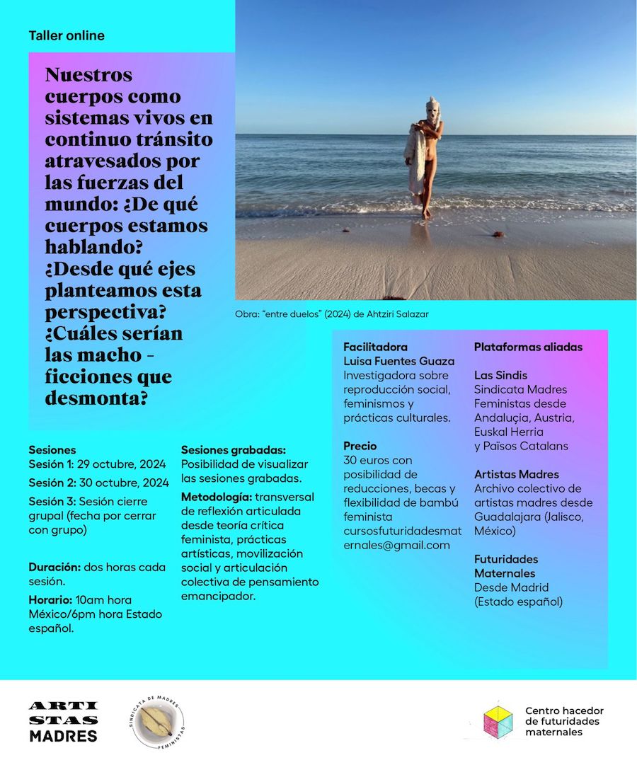 Taller online: “Nuestros cuerpos como sistemas vivos en continuo tránsito atravesados por las fuerzas del mundo: ¿De qué cuerpos estamos hablando? ¿Desde qué ejes planteamos esta perspectiva? ¿Cuáles serían las macho-ficciones que desmonta?” -con la colaboración de las plataformas aliadas Las Sindis – Sindicata Madres Feministas (desde Andaluçia, Austria, Euskal Herria y Països Catalans) y Artistas Madres – Archivo colectivo de artistas madres (desde Guadalajara, México)