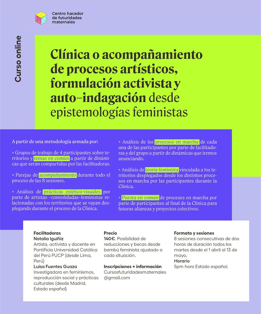 Curso online: “Clínica o acompañamiento de procesos artísticos, formulación activista y auto–indagación desde epistemologías feministas” por Natalia Iguiñiz –artista, activista y docente en Pontificia Universidad Católica del Perú PUCP desde Lima– y Luisa Fuentes Guaza –investigadora en feminismos, reproducción social y prácticas culturales desde Madrid.