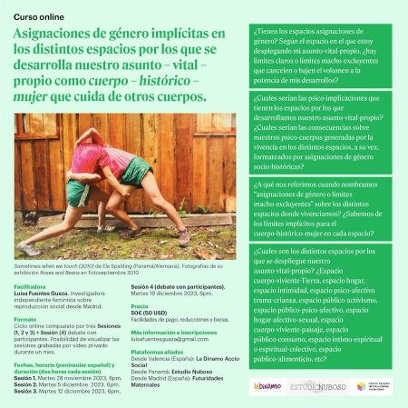 El próximo martes 28 de noviembre comenzaremos este nuevo ciclo/curso compuesto por tres sesiones teóricas (dos horas de duración cada una de ellas) + una cuarta sesión como debate abierto entre lxs participantes. Continuación de lo planteado en el pasado curso Cómo funciona el espacio público respecto al cuerpo-histórico-mujer como cuerpo al que se le asigna el cuidado de otros cuerpos dependientes (septiembre, 2023) en colaboración con Mamá Urbana (Guadalajara, México), Museo de las Mujeres (San José, Costa Rica) y dLAV (Alicante/Pamplona, España) como plataformas aliadxs.